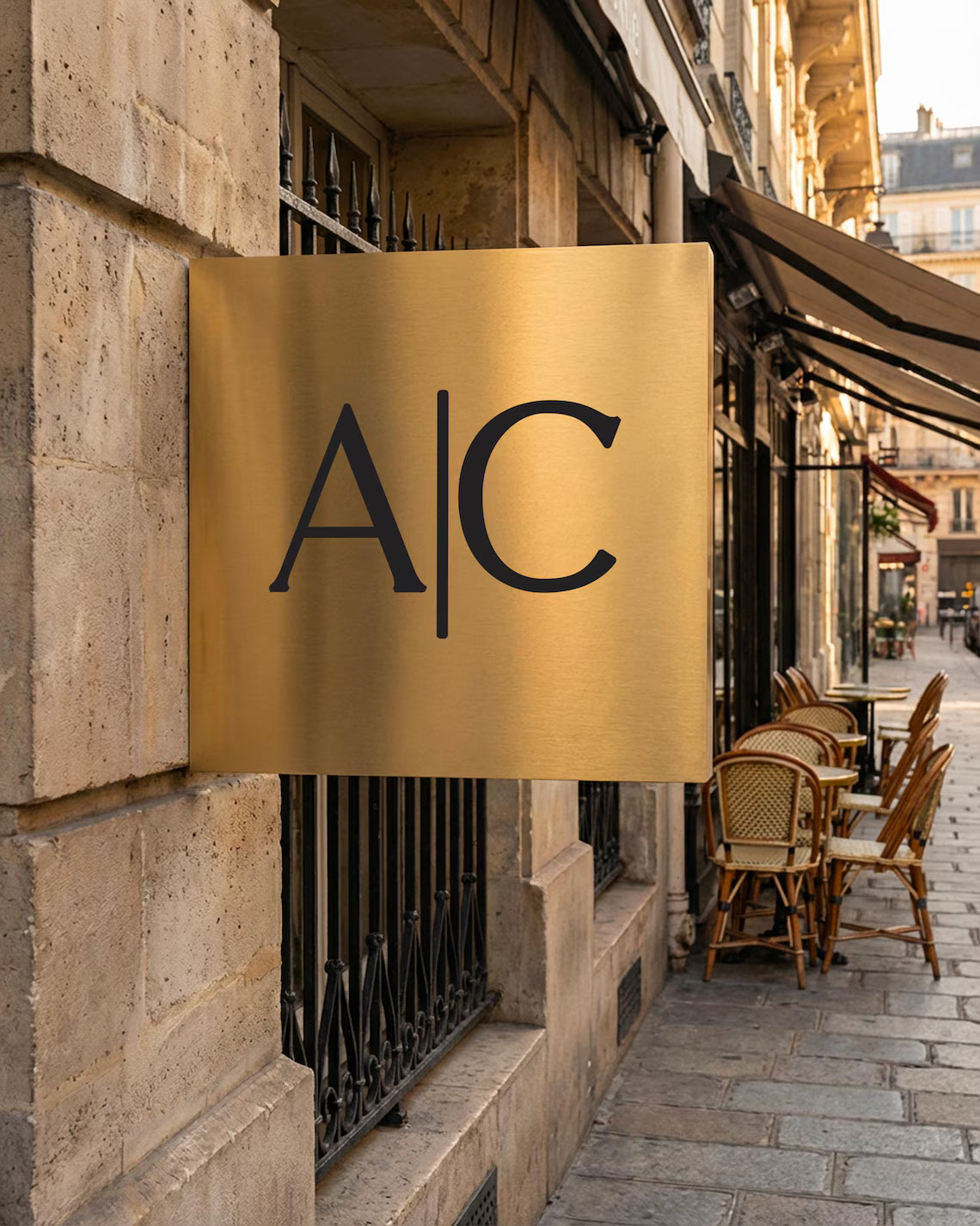 This custom-made double-sided blade sign is designed for businesses that value clean architecture, timeless materials, and refined detail. Whether mounted on a modern concrete façade or a classic street front, it brings a strong yet elegant presence to your space.